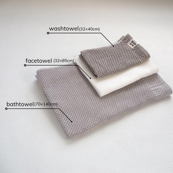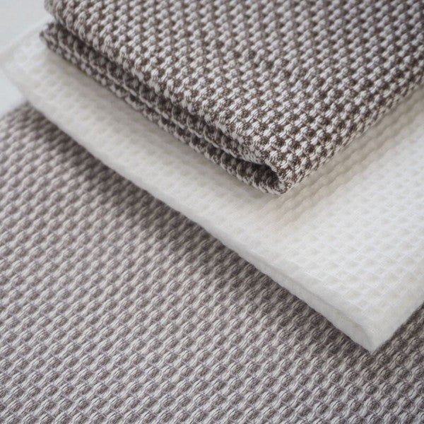 thin yet soft and gentle touch is characterized by the weaving together of hexagonal bumps (honeycomb weave) on the front and coarse gauze on the back. The two-layer structure is soft and fluffy, and its excellent air permeability allows it to dry quickly and to be used cleanly at any time. Certified as a product made in Osaka, Japan.