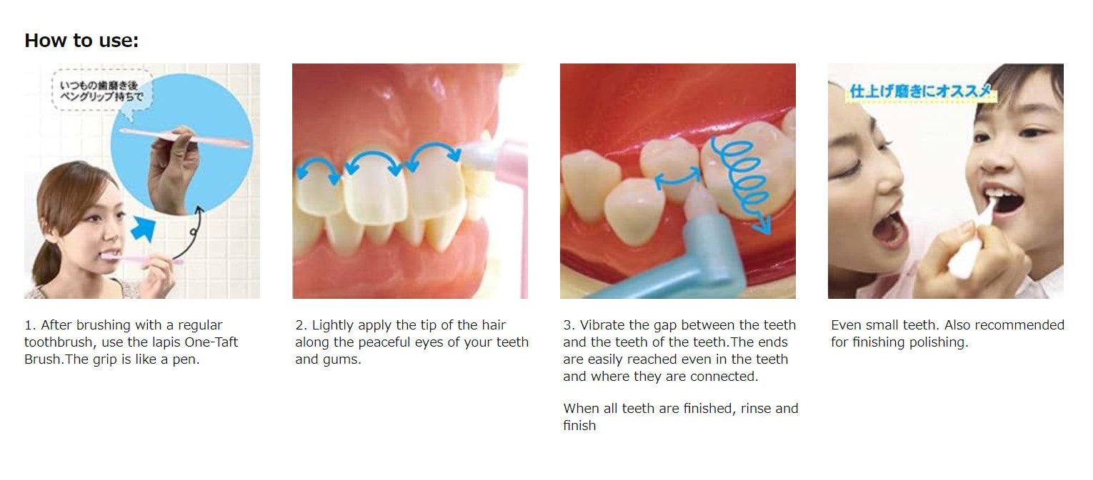 The Lapis One-Tuft Brush is also perfect for follow-up brushing with children. The pointed tip of the compact head is perfect for precise use such as with newly formed teeth or in areas where teeth do not align perfectly and overlap.