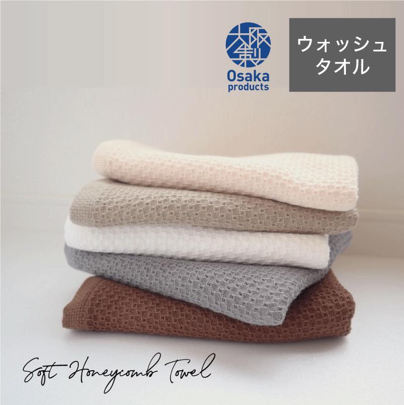 thin yet soft and gentle touch is characterized by the weaving together of hexagonal bumps (honeycomb weave) on the front and coarse gauze on the back. The two-layer structure is soft and fluffy, and its excellent air permeability allows it to dry quickly and to be used cleanly at any time. Certified as a product made in Osaka, Japan.