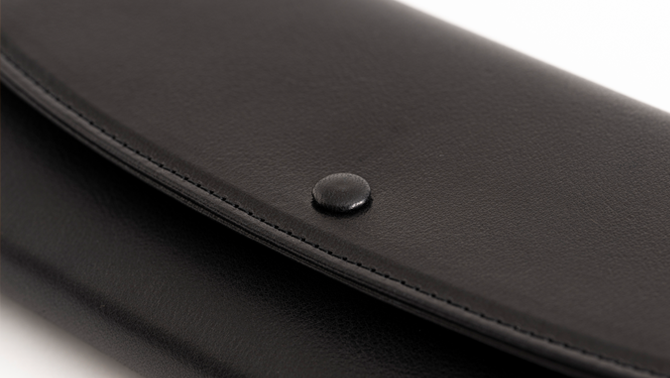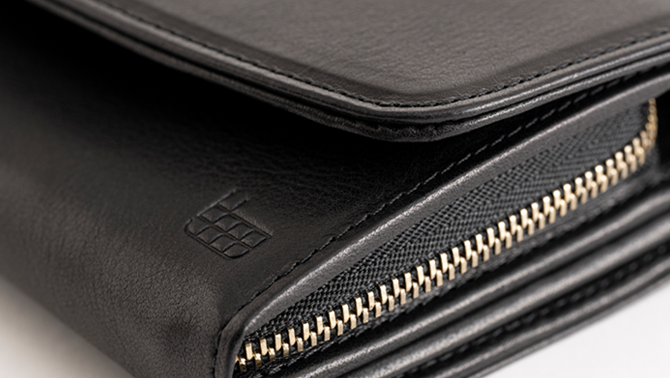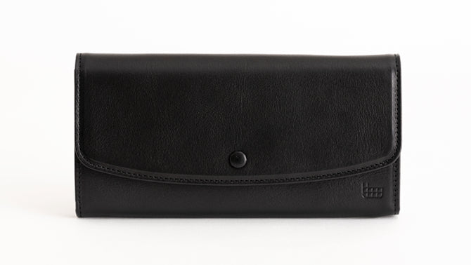 This long wallet features a walnut button with a leather-wrapped clasp.