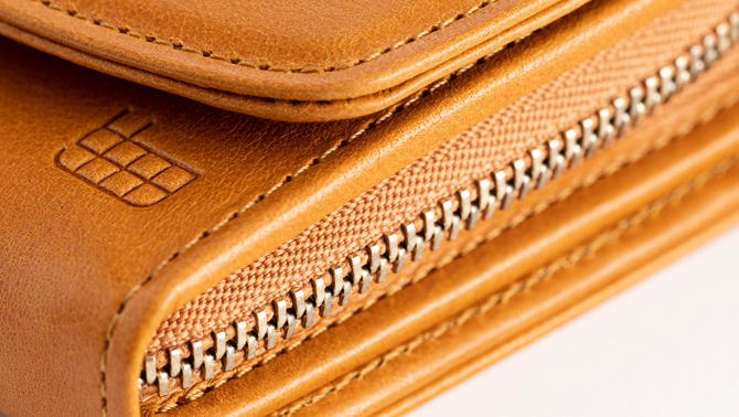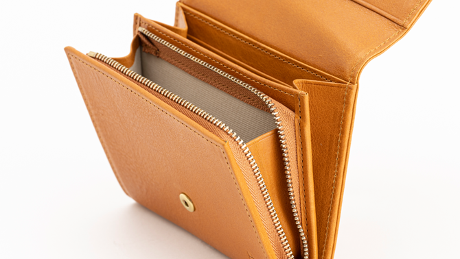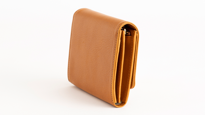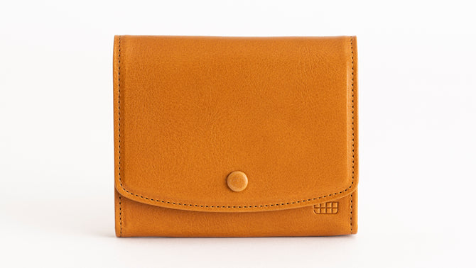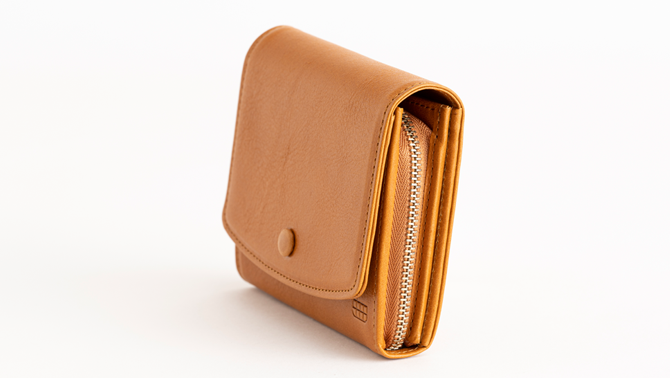 This wallet features a walnut button with a leather-wrapped clasp.