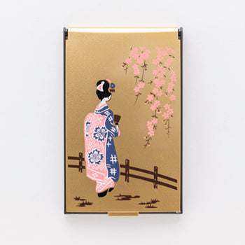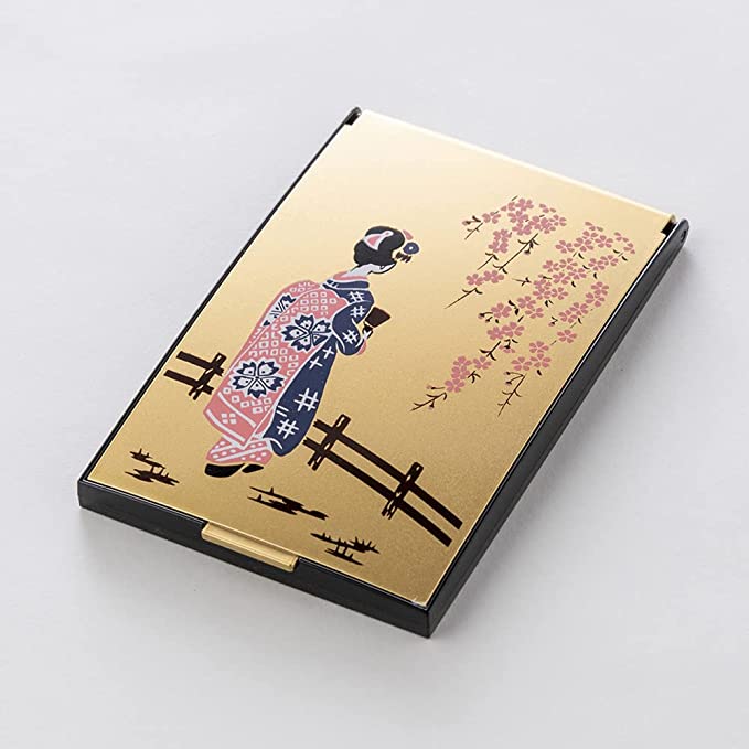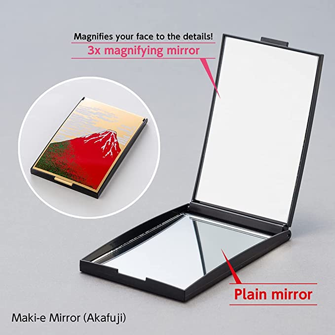 这面镜子受到美容业专业人士的青睐,因为它能清晰地反映出皮肤的颜色,使他们能够找到合适的粉底颜色,并改善化妆的效果。 莳绘镜 莳绘镜是日本的一种传统工艺。 莳绘是一种典型的漆器技术,在日本独特地发展起来,已经使用了大约1200年。容器的表面用细刷子涂上漆,在漆变硬之前将金粉洒在上面,以显示出图案。maki-e "这个名字来自于 "洒落和涂抹 "的意思。Maki-e出口到欧洲和其他国家已有400年历史,在国外仍被称为 "maki-e"。 这款小巧的镜子套装包括一面带Maki-e的等尺寸镜子和一面3倍放大镜。3倍放大镜又薄又轻,便于携带;3倍放大镜是一种具有600r曲率的型号。3倍放大镜是一个曲率为600r的模型。它是皮肤护理的理想选择,如去角质、斑点和皱纹。该产品是日本传统工艺和化妆镜的融合。 尺寸7.8 x 12.5 x 1厘米,重量约110克。 材料 ABS树脂和玻璃镜子 日本制造