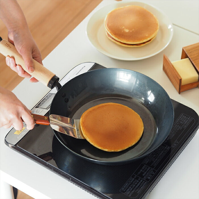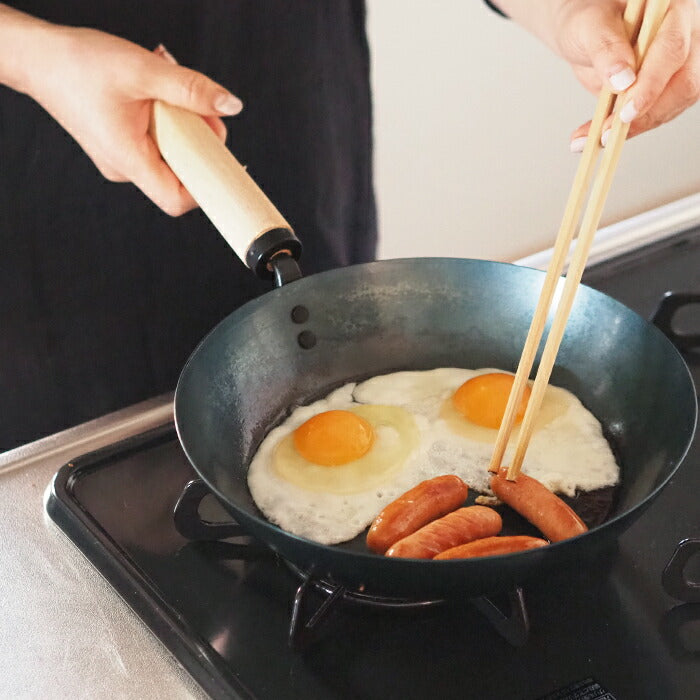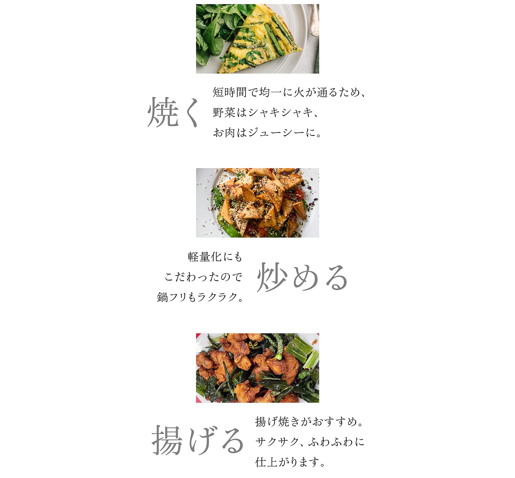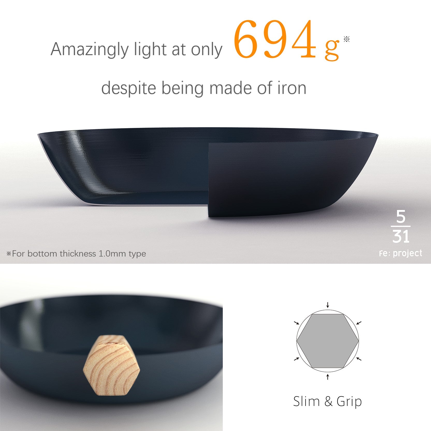 经过反复的原型制作,我们成功地将平底锅做得尽可能薄,底部厚度为 1mm,侧面厚度为 1mm。虽然是铁制的,但重量只有 694g。避免了铁煎锅的弱点。