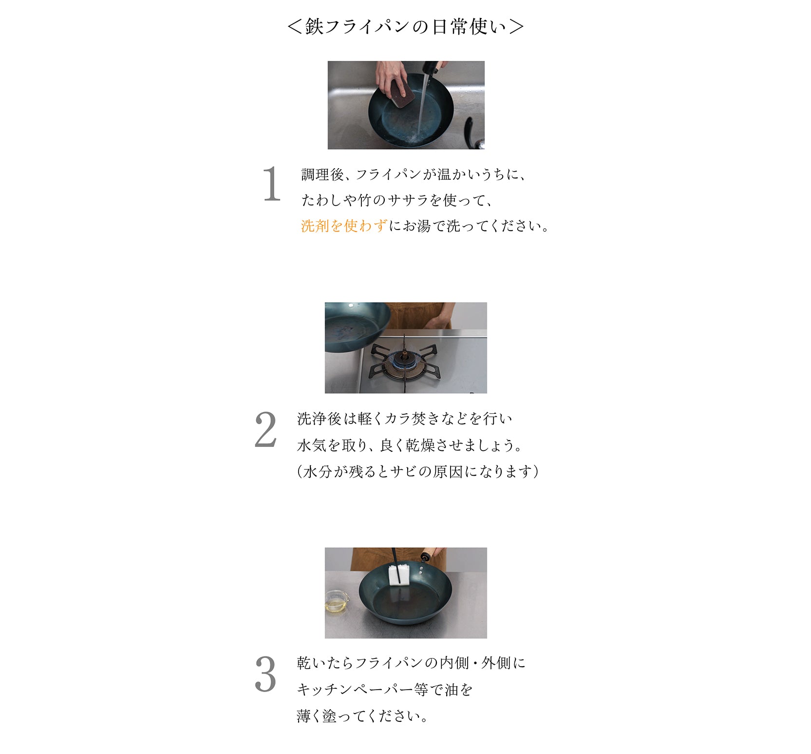 铁质煎锅在使用初期所必需的步骤(开锅和油调理)被纳入制造过程,由工匠们一一手工完成。顾客从购买之日起就可以立即使用他们的铁煎锅(无需开锅)。